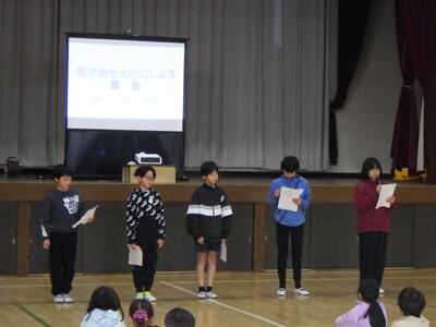 今朝は飼育・栽培委員会による「生き物を大切に集会」が実施されました。飼育しているインコのことなどクイズを交えながら進行しました。