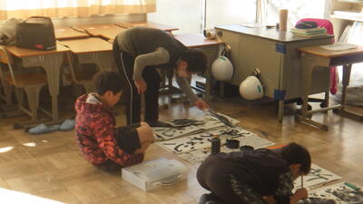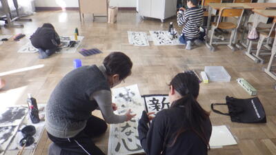 本日は、4、5年生の書きぞめの授業にゲストティーチャーを招いて実施しました。11月に3年生の書きぞめにも来ていただきました。