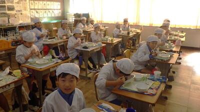 今日の給食は、寄居町合併70周年を記念した給食でした。子供たちは「いつもおいしいけど、今日はとってもおいしい!」と笑顔でした。町の特産品や歴史も学ぶことができました。