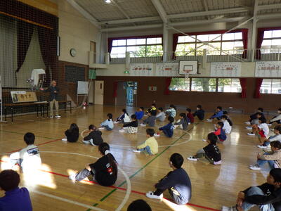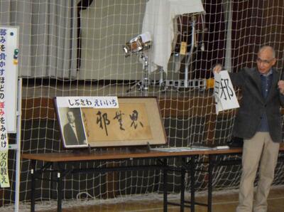 今朝は、上平・下小路にお住まいの神田昌文さんにご来校いただきました。ご自宅に所蔵している渋沢栄一翁直筆の書「思無邪」という言葉から、人権や思いやりの大切さについて全校児童に向けてお話しいただきました。