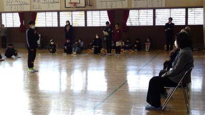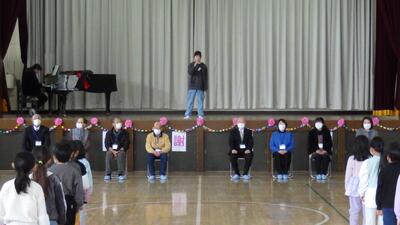 2月3日(火)に全校朝会を実施しました。子供たちと一緒に大きな声で「鬼は外!」と叫びました。