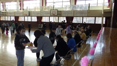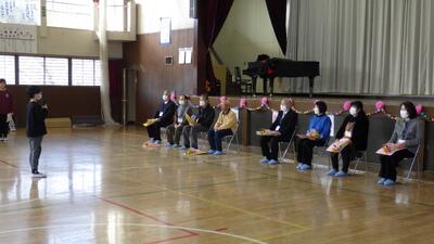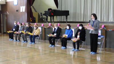 今朝は、折っ子の登校を見守ってくださっている見守り隊の皆様をお迎えして、子供たちから感謝の気持ちを伝える「感謝の会」を実施しました。